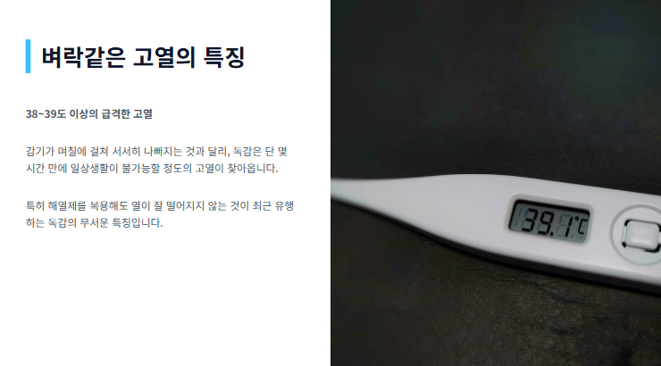 - 38~39도 이상의 급격한 고열: 해열제를 먹어도 열이 잘 떨어지지 않는 특징이 있습니다.