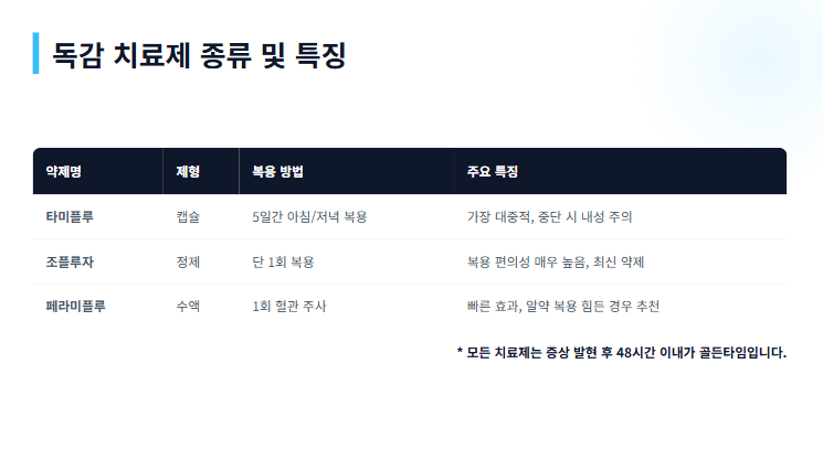 - 조플루자: 단 한 번 복용으로 치료가 가능해 최근 선호도가 높습니다.